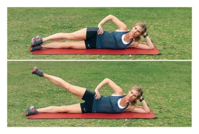 动作要领:侧躺时上身被手肘撑起,双腿自然弯曲,双膝一开一合,像蚌壳,双脚始终贴合在一起。每个侧面做20-30次。