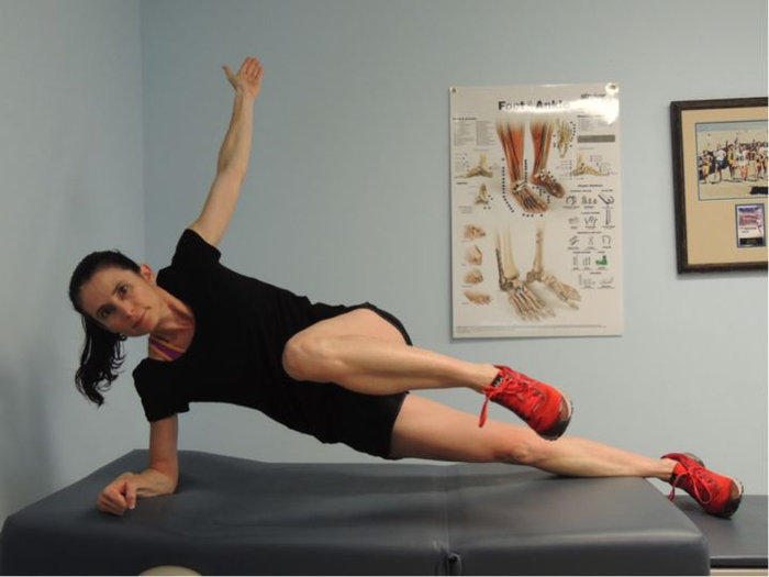 侧平板支撑姿势,然后提膝,呈跑步姿势,每个侧面坚持30秒。