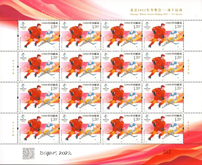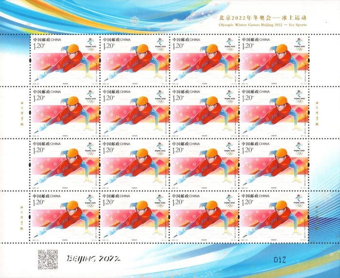 此次发行的《北京2022年冬奥会——冰上运动》纪念邮票1套5枚,邮票图案分别表现了短道速滑、花样滑冰、速度滑冰、冰壶和冰球全部5个冰上运动项目。邮票设计者张强介绍,这套邮票采用了电脑手绘的表现方式,整体画面色彩鲜明饱满、线条简洁流畅,展现了运动员在冰上的飒爽英姿和精彩瞬间,运动员造型富有张力、充满动感,体现了各项运动的灵动与技巧之美、速度与力量之美。邮票背景使用特殊感光油墨印刷的雪花晶莹剔透,整版边饰上的“BEIJING2022”字样则采用镂空工艺,营造出喜迎北京2022年冬奥盛会的热烈氛围。通过手机扫描整版邮票边饰上的二维码,可以观看5个冰上运动项目的视频短片,集艺术性、趣味性、科技性和防伪功能于一体。冰上运动邮票发布同时,中国邮政集团有限公司还推出了首日封、纪念封、邮折、邮册等系列邮品在各邮政网点销售,部分商品还可在北京冬奥会特许商品官方网店(http://beijing2022.tmall.com)和北京冬奥会特许商品零售店购买。