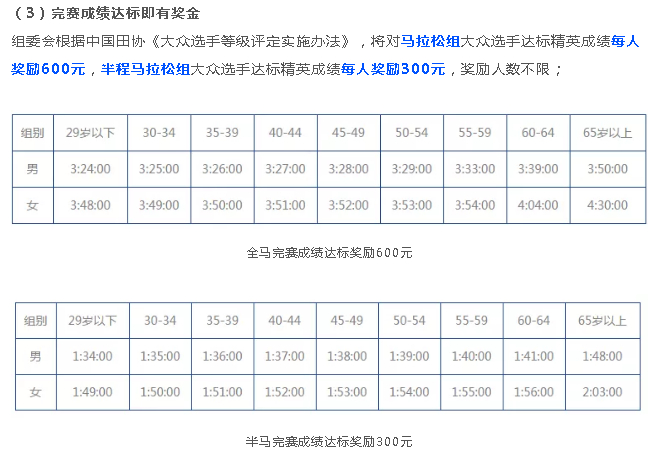 为了鼓励大众选手,组委会对马拉松组大众选手达标精英成绩每人奖励600元,半程马拉松组大众选手达标精英成绩每人奖励300元,奖励人数不限!