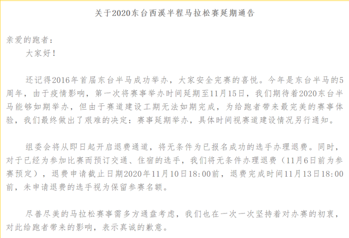 11月6日,东台西溪半程马拉松组委会发布通告,受赛道建设工期无法如期完成影响,原定于11月15日举办的赛事延期,具体时间待定。