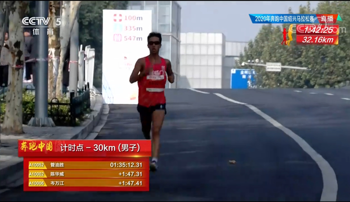 30公里用时1小时35分12秒,管油胜独自领跑,陈华威、岑万江紧随其后: