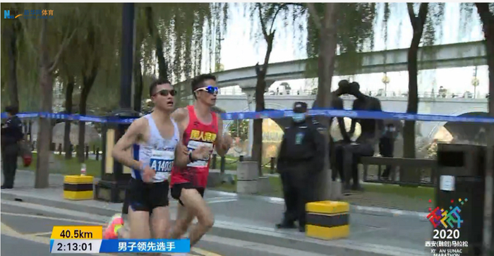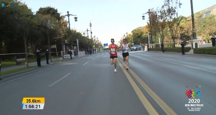 35公里时,杨成祥掉出第一集团,仅剩下杨定宏和尹顺金并驾齐驱: