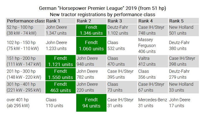 这个表格是以2019年间市场上所注册的新拖拉机为基础,然后以拖拉机马力为单位,分为六个级别: