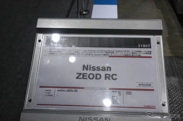 2013年10月,总共历时了8个月测试的最终版ZEOD RC日前在日产Nismo总部终于正式亮相。与此同时,关于此车型日产方面称,”新装配的电力驱动小型轻量级涡轮引擎实现了电能动能的转换,可回收刹车动能用于发电”。并表示”在勒芒24小时耐力赛上约13.7公里的赛道上全程仅依靠电力行驶”。