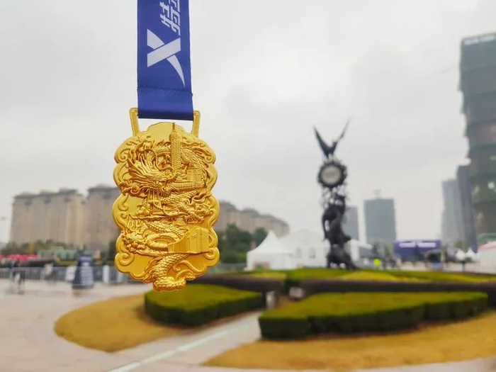 完赛奖牌镀金龙身浮雕,显得大气磅礴,有一种飞龙在天的气势。非常棒。有跑友说色调比较单一,如果配合点缀一些其他亮色,可能会更漂亮。