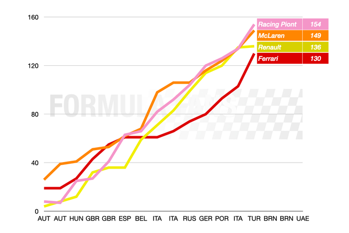 车队层面,赛点、迈凯伦、雷诺和法拉利将会为年度第三展开激烈争夺。从积分走势来看,赛季初迈凯伦和法拉利“高开”,赛点受到了“违规抄袭”的罚分处罚,而雷诺在开局的几场比赛中并未找到感觉。随着比赛的进行,法拉利在赛季中段逐渐掉队,而雷诺渐渐地在赛车调校方面找对了方向,成绩也有了不俗的起色奋起直追。
