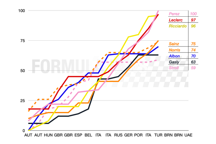车手层面,Perez、Leclerc和Ricciardo三人焦灼在一起,其中Perez和Leclerc皆是凭借土耳其大奖赛的优异表现反超了Ricciardo。而身后的一个五人小军团则是由两位迈凯伦车手领衔,另外还有Albon、Gasly和Stroll。