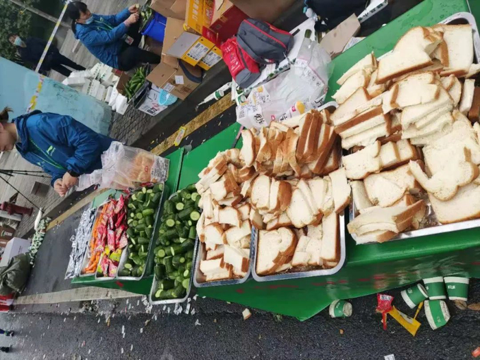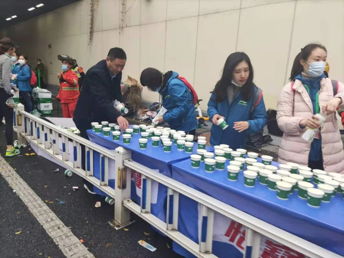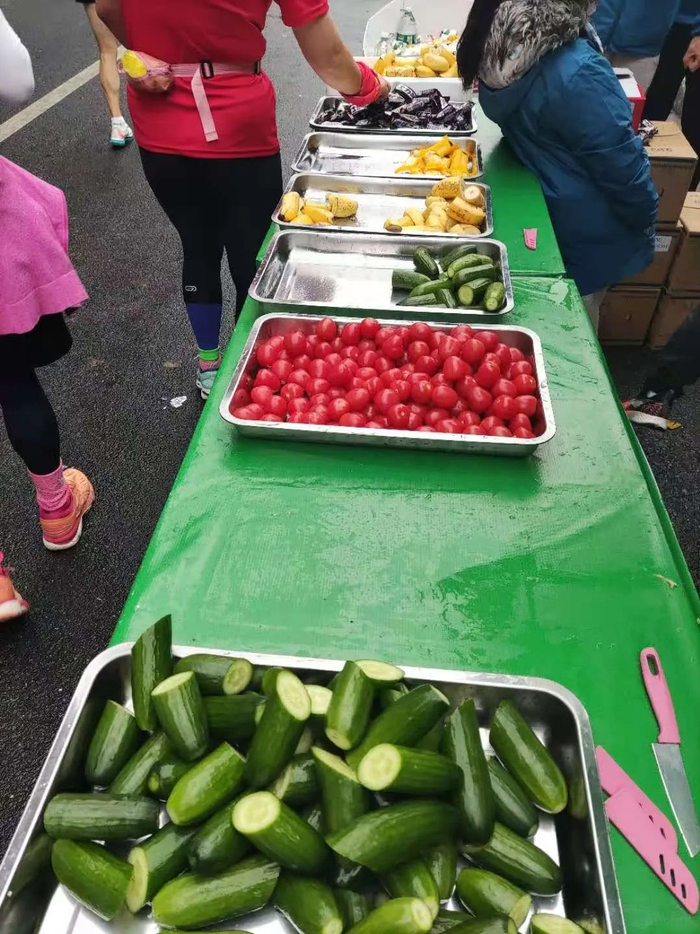 赛道前几个补给站,饮水还没有来得及倒进纸杯,都是整瓶的让人拿。赛道补给站的食物相对充足,但是有的食物站后面没有水站,会使得运动员吃的太干。