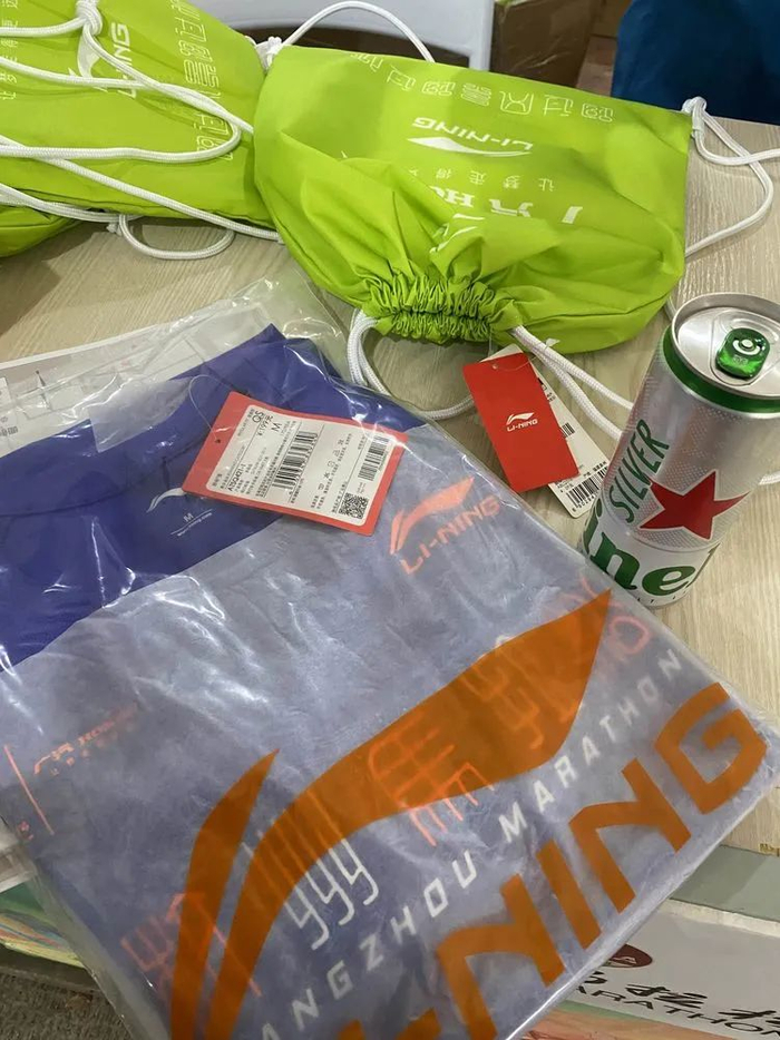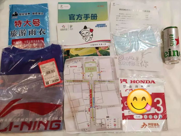 参赛包里提供了李宁参赛服、雨衣、彩票、口罩、喜力啤酒、起点布局图、防疫承诺书。
