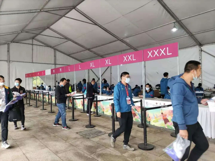 选手们自20日开始在马博会现场戴好口罩、带着核酸检测报告和相关健康证明领取装备,领物流畅。马博会较简单,展商不多,官方赞助商李宁提供参赛服印字、装备现场售卖,以及高科技互动游戏。