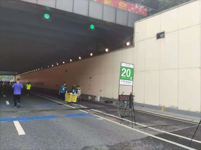 马拉松的计时地毯有19个,半程马拉松有7个,铺设更密集,监测更精准。除了38公里的公里牌倒了以外(风太大),都不错。