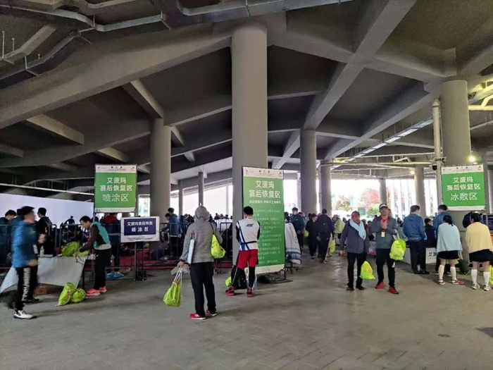 终点喝到了姜茶,取物流程顺畅有序,学生志愿者为我们挂上奖牌、为我们鼓掌。有冰敷拉伸。