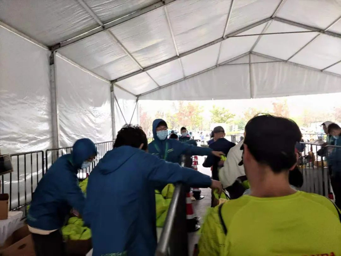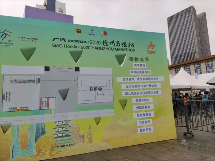 领物只要按要求出示了14天行程记录和纸质核酸检测报告,基本5分钟可以领完,没有纪念品可买,有比较简单的马拉松展会。