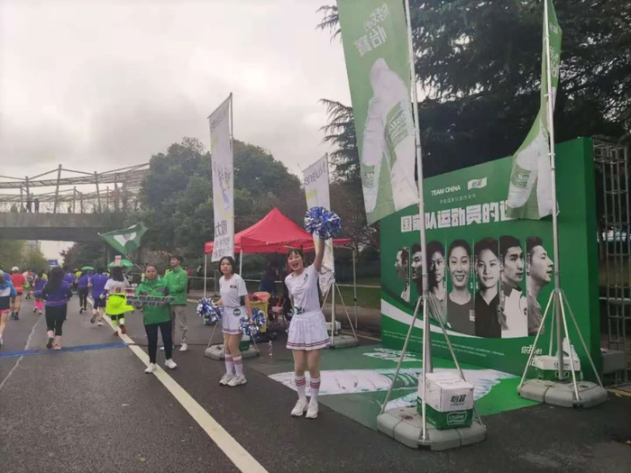 看到志愿者拿着小标语加油牌,上面写着向跑友们征集来的加油句子,因为太小了经常看不清。