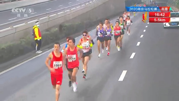 但令人诧异的是比赛刚开始,很多直播画面显示领先的并非兔子,而是正式参赛选手,不仅刚开始,甚至跑到玄武湖10几公里赛段,彭建华等选手也一度领跑,这样看似“不专业”的画面在国际大赛中是非常少见的,只有兔子跑不动退下来的,没有说正式选手跑到兔子前面去的。