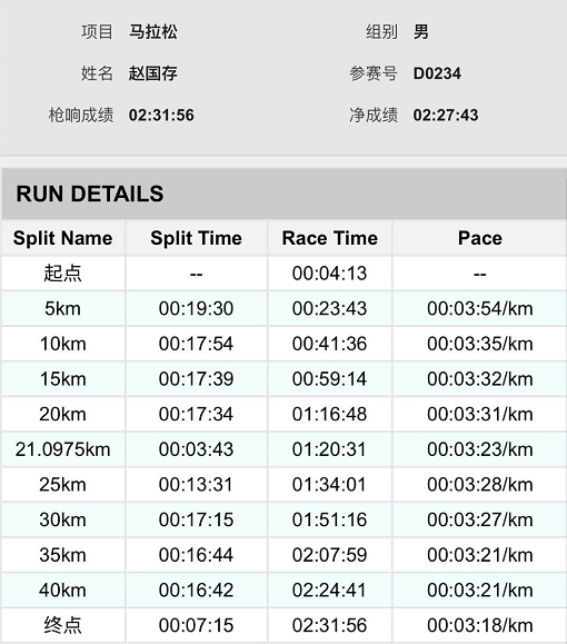 后来经过查询得知,这名选手叫赵国存,是青海省的一名残疾人运动员,本次比赛他的最终完赛成绩是2小时27分43秒!