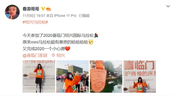 今年除了汶川马拉松,牛钰还参加了绍兴马拉松的迷你跑,她跑得很开心。