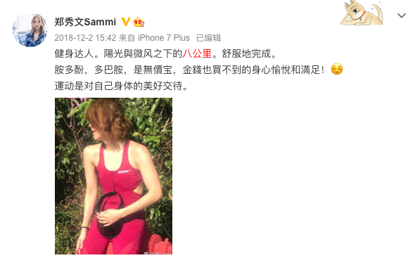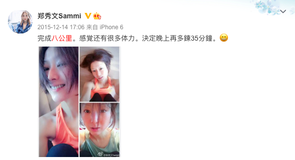对于归来的郑秀文,减肥也不再是单纯的挨饿,而是享受跑步和运动带给她的快乐。翻看郑秀文的微博运动日志,跑步是她这十年来最主要的运动习惯,而且每次都不多不少,正好八公里。