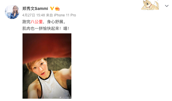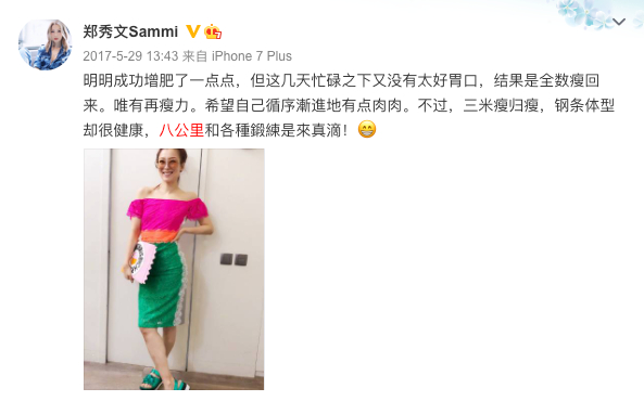 除了闷头苦练,她还会把一些运动心得,通过微博分享给大家,俨然已经成为一个专业的健身教练。