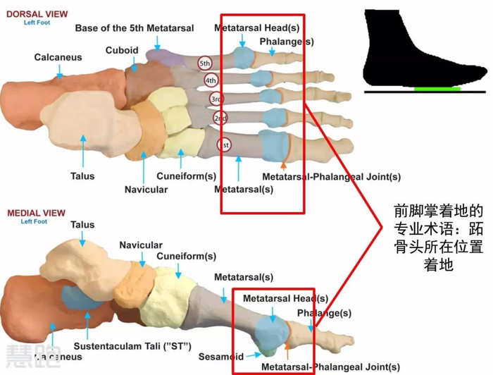 前脚掌跑的着地点泛指的是跖骨头所在位置,通俗点说就是脚掌前1/3与后2/3交界处的位置着地,英文原意为中足跑(middle foot),但中足不符合我们中国人的表达方式,我们更愿意将其称为前脚掌着地,但非脚尖着地。