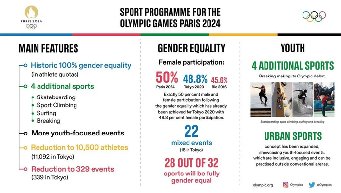 国际奥委会表示,做出这些决议的出发点是贯彻《奥林匹克议程2020》的三大奥运瘦身原则:推动奥运会年轻化、控制参赛规模、鼓励性别平等。巴黎奥运会的10500个参赛选手名额将比2020年东京奥运会的11092个减少592个,同时尽可能减少一些男性比赛项目转而增加一些男女混合项目,巴黎奥运会将有22个大项设置男女混合比赛项目。国际奥委会还非常自豪地指出,巴黎奥运会将历史首次实现女性参与者比例达到50%。而东京奥运会的女性比例也将达到48.8%。