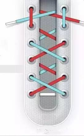 采用这种系鞋带方法的优点是牢固,而且简单易上手,由于交叉相压,因此这种方法,也不容易导致鞋带松开。