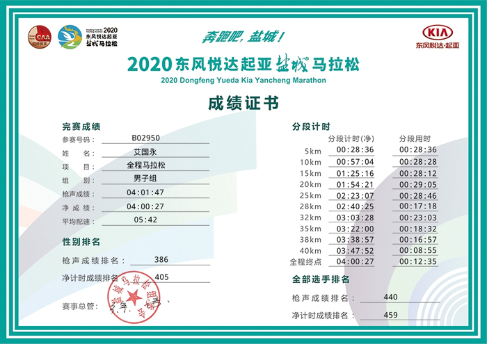 从数据可知,绝大部分跑鞋的品质值得信赖,比如,这是我自己穿的一双,陪我跑了盐城马拉松,4小时0分27秒,帮助我只差28秒,被挡在了破四的大门之外,而这,已经是我目前为止最好的全马成绩——