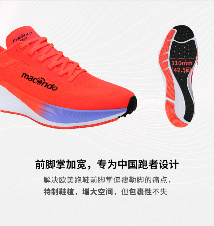 (1)根据中国人脚型,在前脚掌采用了加宽设计;