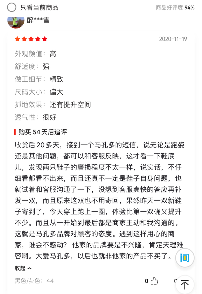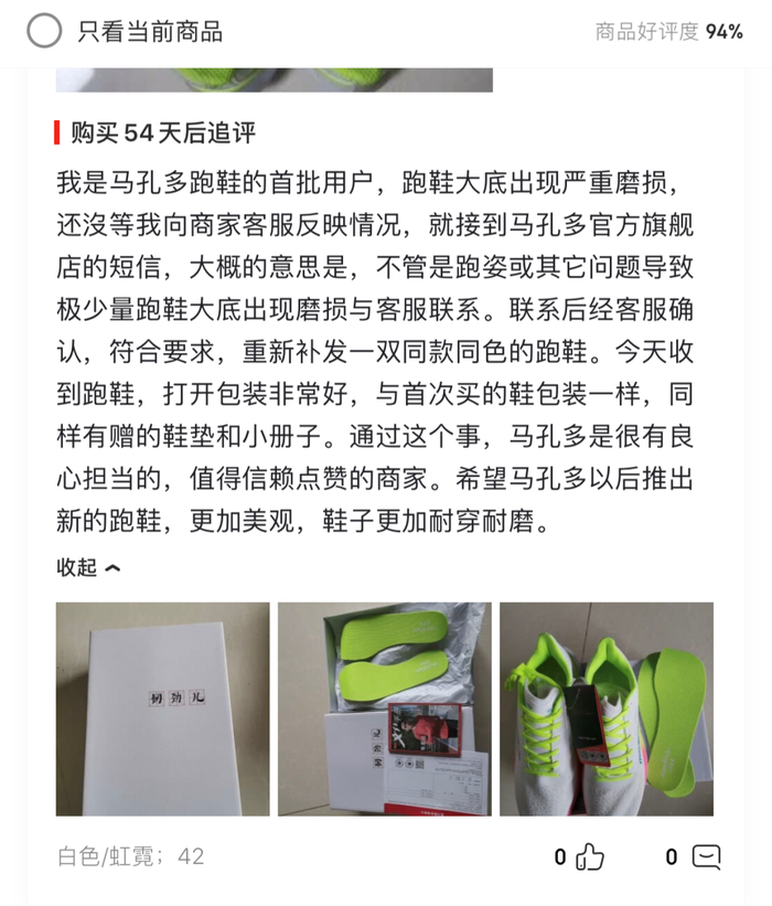如果从整个跑鞋界来说,94%的好评率,并不低,甚至属于较高的,但在我们马孔多和合作伙伴看来,仍是一个不及格的分数。我们划定的及格线是好评率96%以上。