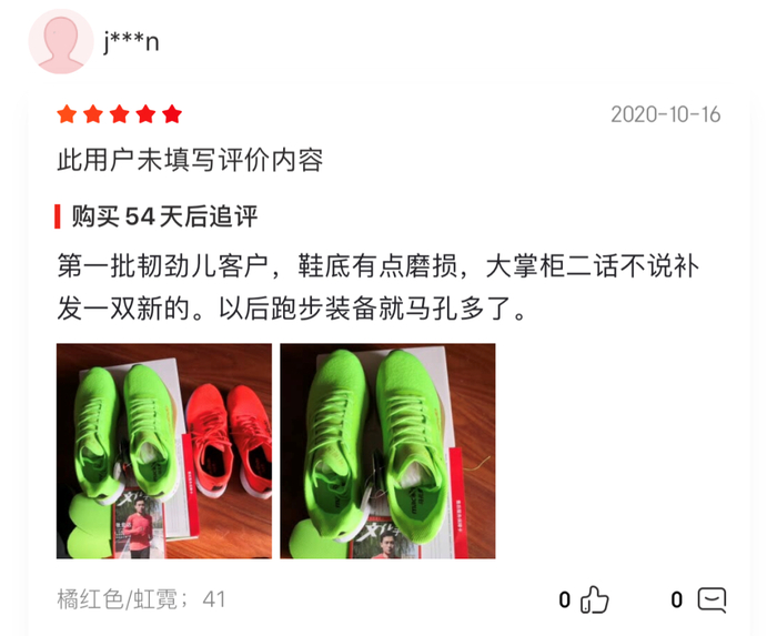 ▲对于极少部分大底不耐磨的问题,我们全部补发了新鞋,让跑友投诉有门、购物无忧,是我们努力的方向。