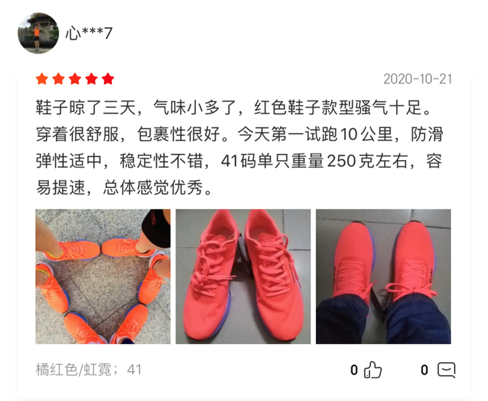 (1)气味:第一批跑鞋,最为跑友诟病的地方是,气味太大,有跑友说晾在阳台上一个礼拜味道仍未散尽,这让我们特别汗颜;