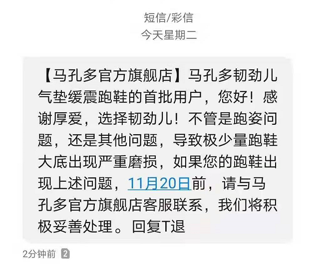10月10日下单购买马孔多跑鞋的跑友,时隔一个多月,在11月17日,收到了这样的一条短信: