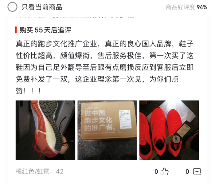 ▲我们会努力把6%的不好评价,进一步降低,没有其他捷径可走,只有通过提升跑鞋品质和购物体验来实现。