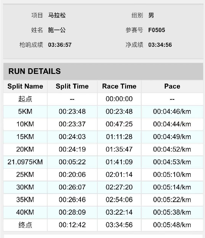 从赛事计时统计来看,施院士前半程半马用时1:41:09,均速4分48秒,很是不错;但后半程则出现了明显的掉速,用时1:53:47。