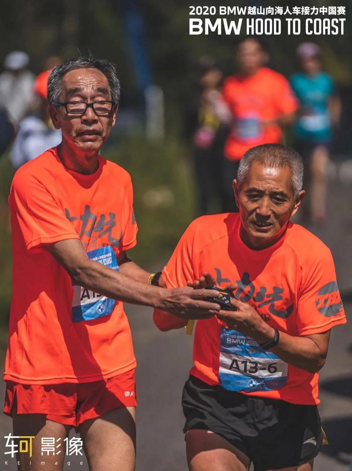 两位大爷在越山向海比赛中交接棒,跑步不分年龄,你我共分享。