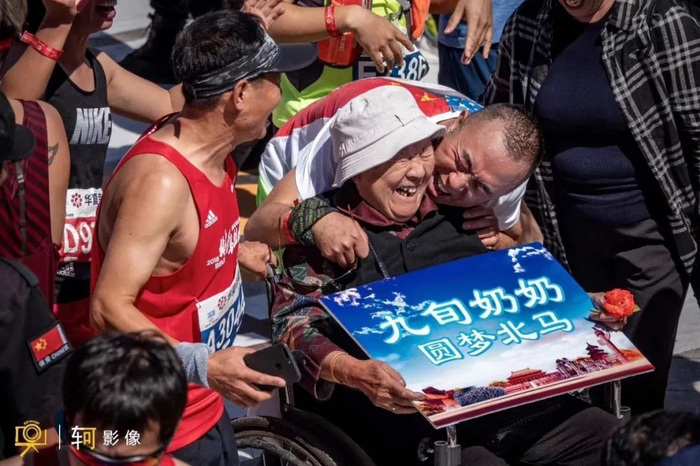 这是北马终点,一位老奶奶手捧“九旬奶奶圆梦北马”的牌子,她的儿子刚刚跑完北马。