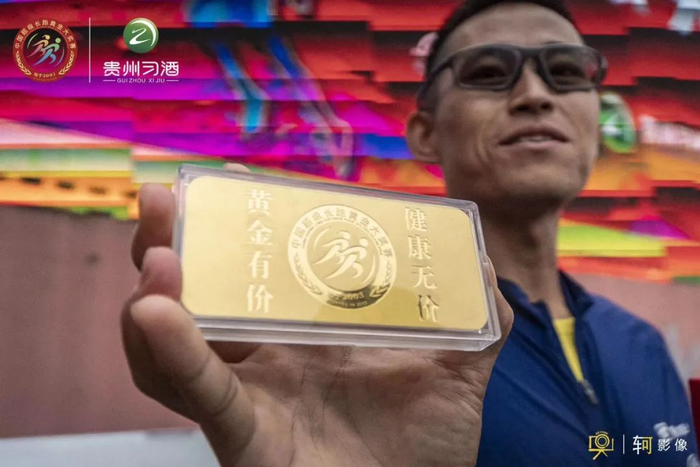 这张照片是越野赛高手梁晶参加2019年赤水河谷超级长跑黄金大奖赛获得冠军,手持一块金条的照片。