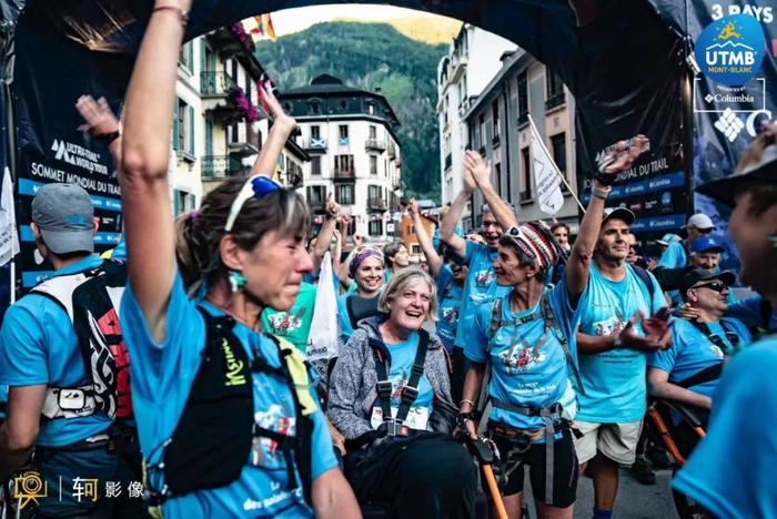 中间这位轮椅选手在十几位同伴帮助下完成UTMB比赛,平路可以推行,而山路往往需要两名同伴抬着前进,在终点处所有人都欢欣鼓舞,画面感染力超强,这就是体育的力量。