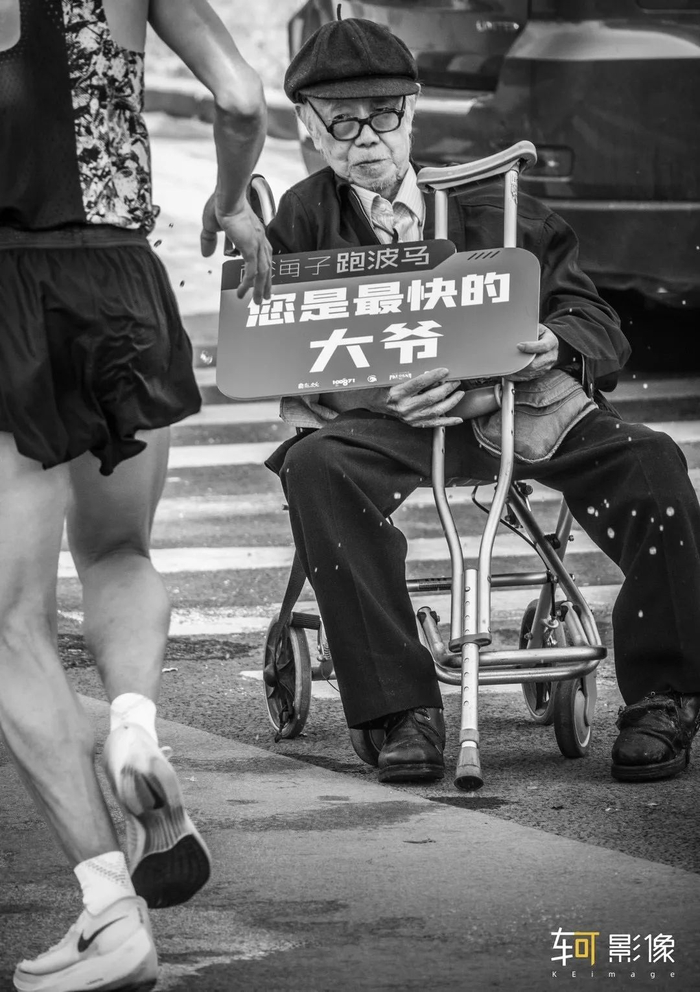 这位大爷三代都是北大人也都是跑步爱好者,大爷现在已经没法跑步了,但还是亲临现场观看比赛,他的眼神直勾勾盯着选手,透露出对于跑步的那份执念、热爱和不舍,牌子“您是最快的大爷”更是画龙点睛。