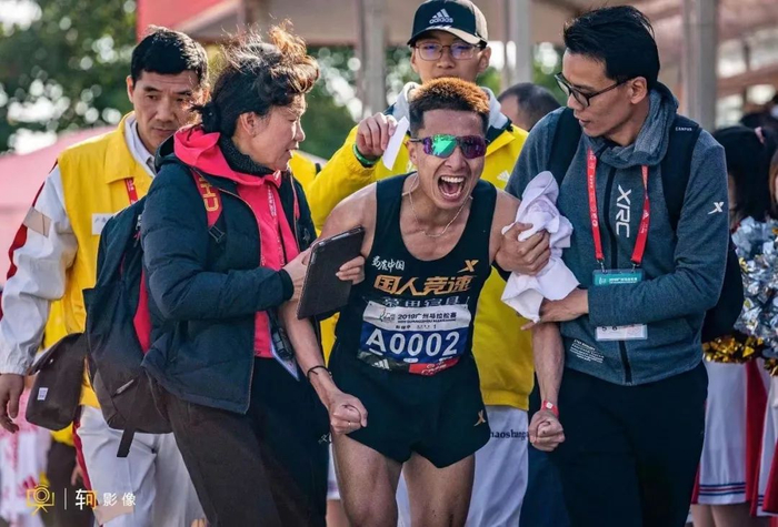 2019年广州马拉松终点,董国建以2小时09分完赛,创造了中国马拉松历史第四好成绩,王军霞上前祝贺董国建,上一代马拉松人和这一代人在这一刻完成接力棒传递。