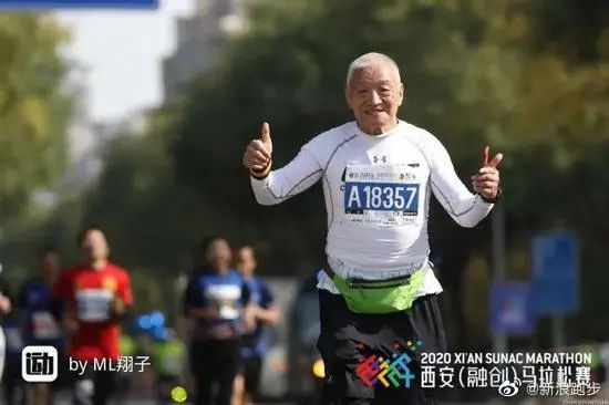 11月8日,2020西安国际马拉松赛场上,81岁陈金钟大爷身穿印有“我在你前面,生命不息,跑步不止!”T恤, 鼓舞了周围很多的年轻人,最终陈老用时6小时14分完成了全程马拉松,现场无数人为其欢呼。
