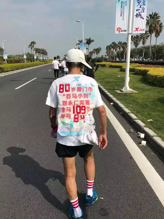 2020年厦门马拉松鸣上,他穿着白色T恤,背面印着一段鲜红色的字,格外醒目:80岁厦门市“百马小刘”,刘永仁完赛全马109个,半马84个。在此次厦马的比赛中,他又成功完成了自己全马的挑战,为全马完赛数量再增加了一场。