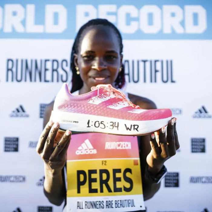 而肯尼亚选手Peres穿着这双鞋,以1小时05分35秒打破了纯女子半马世界纪录,在顶级竞速跑鞋的竞争中,阿迪达斯近两年有些被耐克压得喘不过气来,而借助 adizero adios Pro 在今年算是扳回一局。