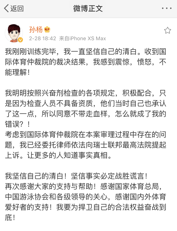 孙杨本人很快对他个人运动生涯产生极大负面影响的事件进行了回应,他坚决否认指控,并且不服判决并上诉至瑞士高等法院。