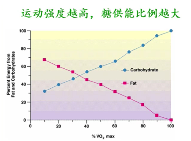 在看第二张图,脂肪代谢的比例,是随着运动强度的提高而减少,因此长距离训练需要温和的运动强度。