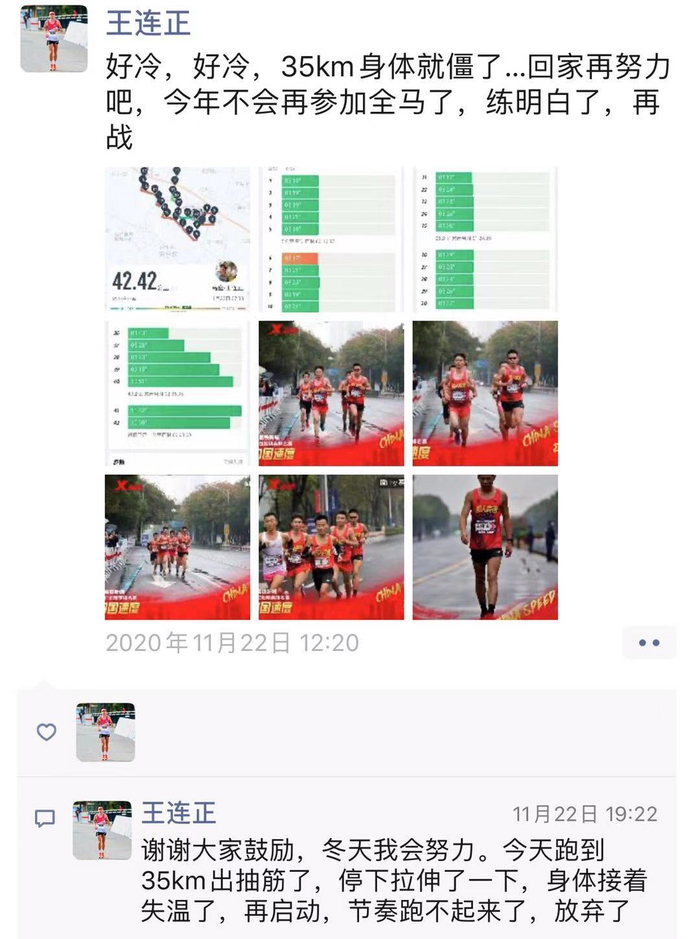 11月8日和22日的绍兴和常州,王连正均于后程跑崩。走在常马飘着冷雨的赛道上,他开始反思:“以前只跑半马,训练量不匹配全马目标,自己几斤几两很清楚”。
