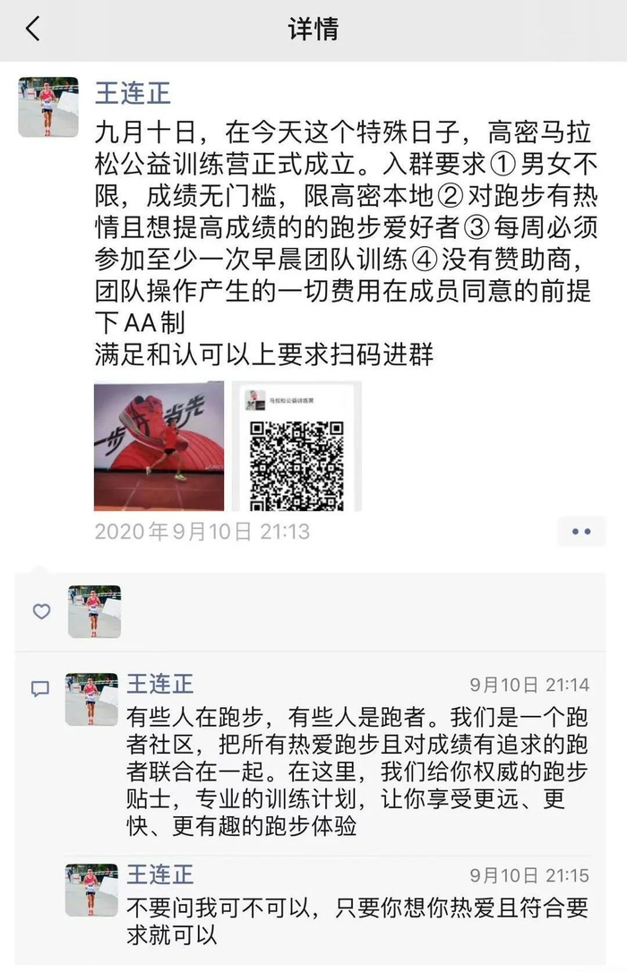 利用自己在当地跑友中的影响力,王连正当天就成立了一个公益训练营。