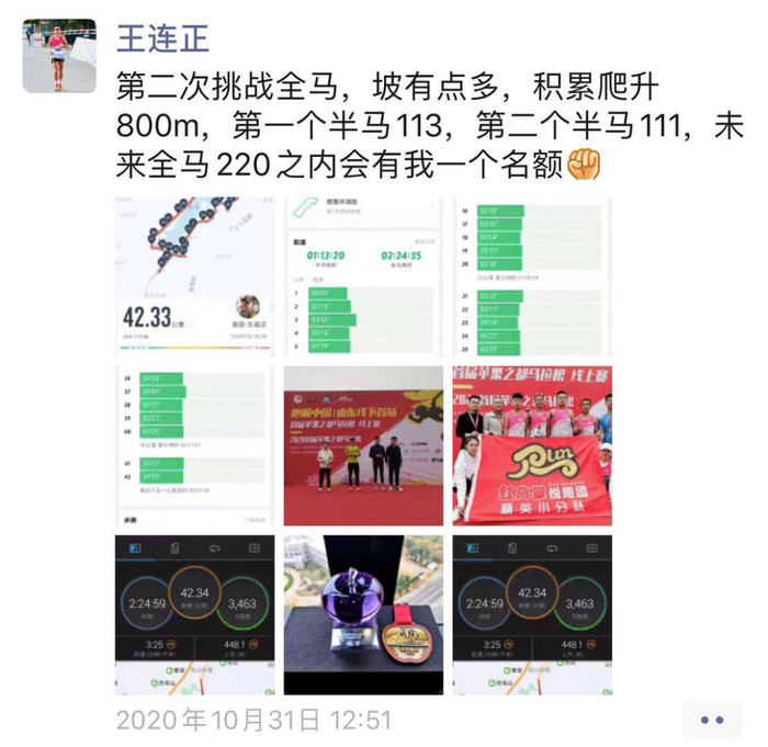 这样的跑量与训练强度下,今年10月31日的烟台栖霞,王连正第二次跑全马,赛道起伏不平有风的情况下,跑出了224的PB。