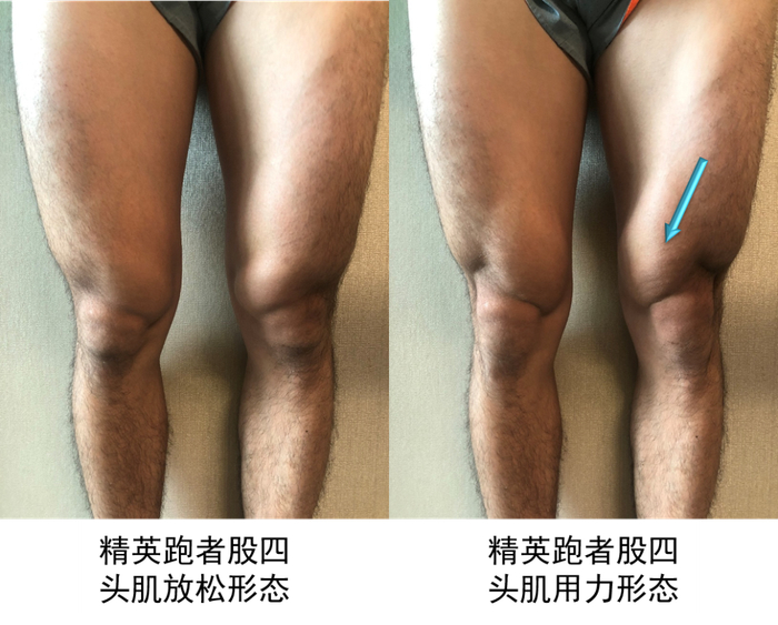 而成熟跑者股四头肌内侧头在放松时有一定隆起,用力时肌肉轮廓较为明显,这就意味着股内侧肌与股外侧肌力量较为均衡,促进了髌骨运动轨迹正常化。
